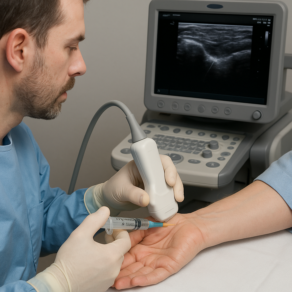 Η υπερηχογραφία του μυοσκελετικού συστήματος μπορεί να συμβάλει ή να βάλει τη διάγνωση επώδυνων συνδρόμων του και να επιτρέψει την ακριβή, ασφαλή και αποτελεσματική εφαρμογή ελάχιστα επεμβατικών τεχνικών θεραπείας.Χαρακτηριστική είναι η εφαρμογή της σε συνήθη σύνδρομα της άκρας χειρός που ταλαιπωρούν δραστήρια άτομα για μεγάλα χρονικά διαστήματα οδηγώντας τους συχνά στο χειρουργείο.